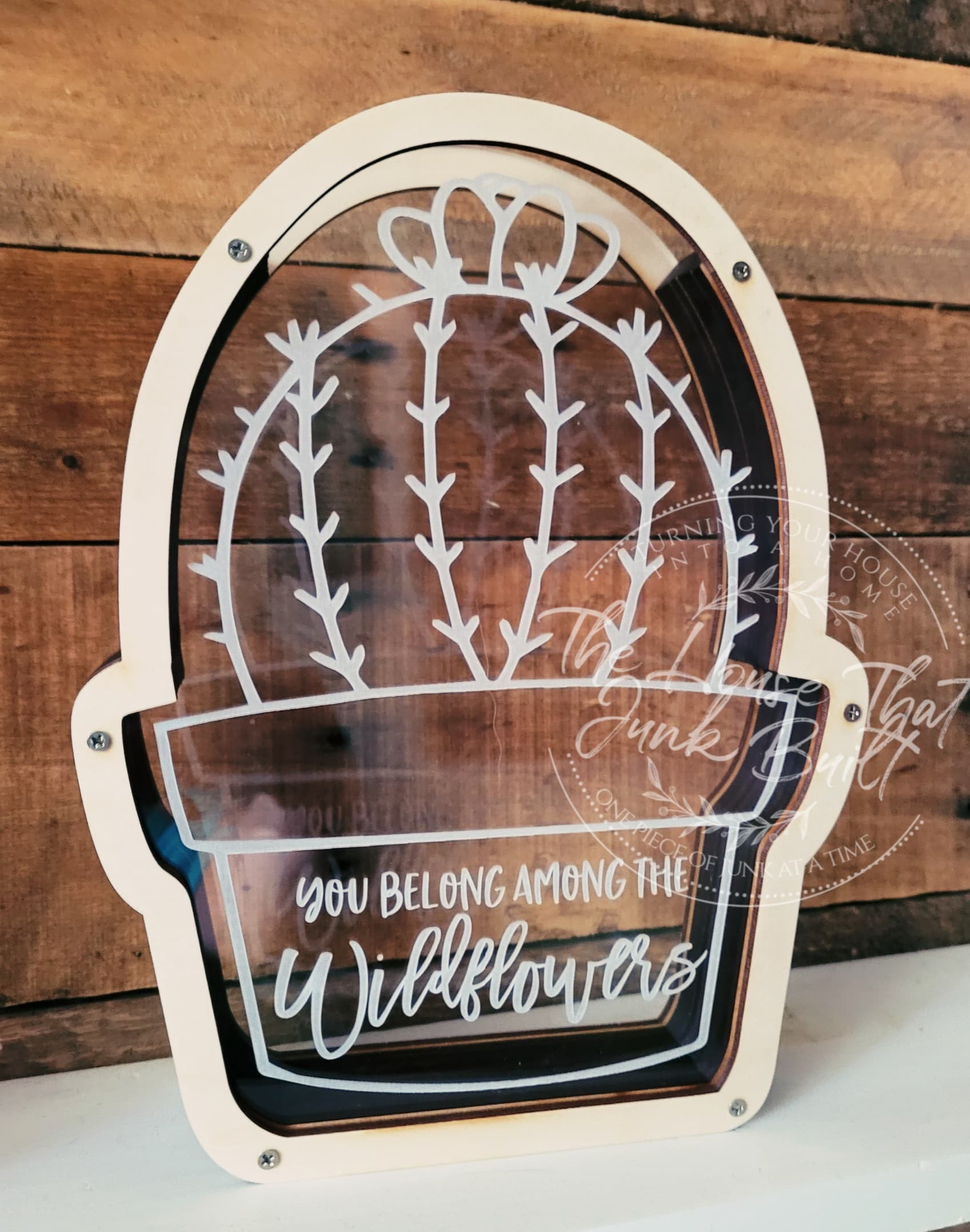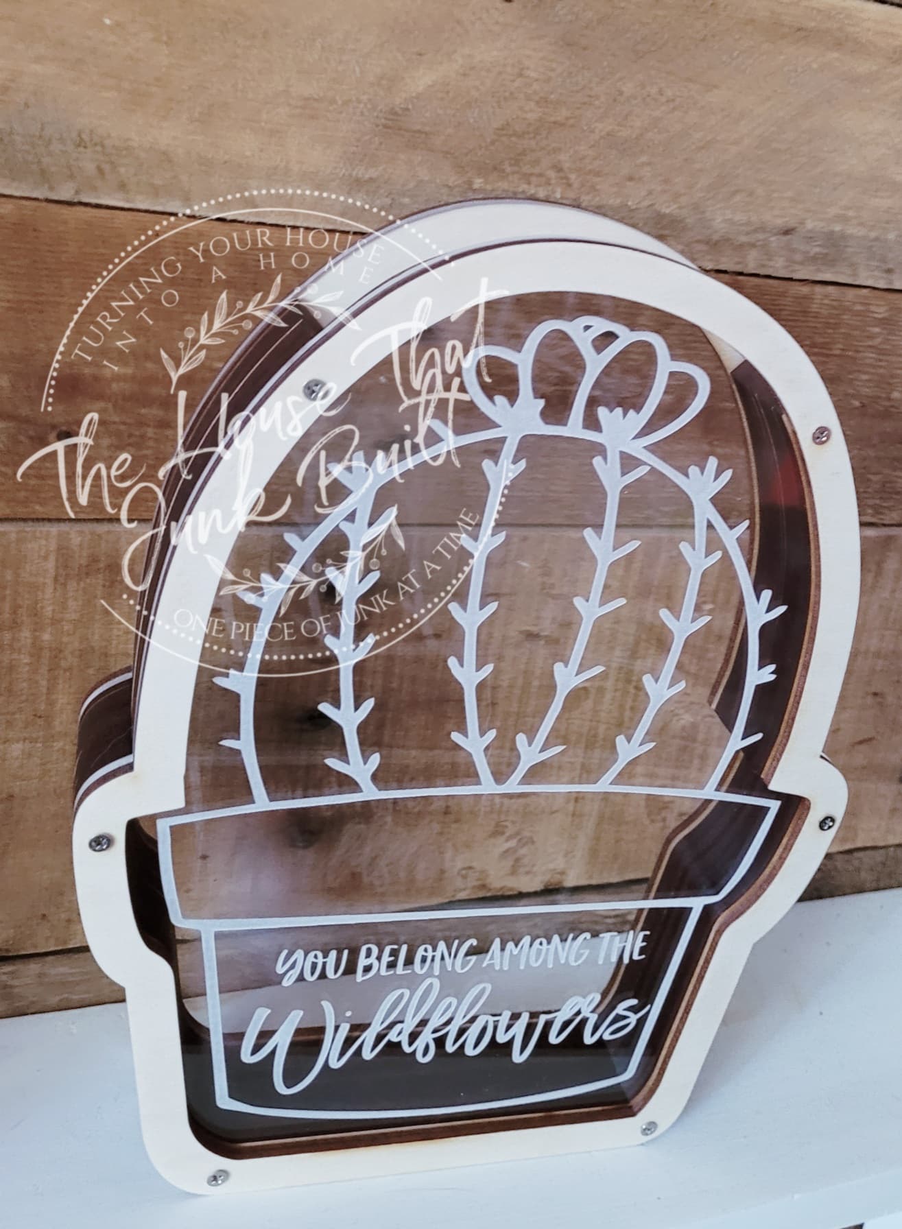Adorable Cactus free-standing piggy bank. Can be customized with your choice of phrase. Dimensions are approx 6x9x2.5