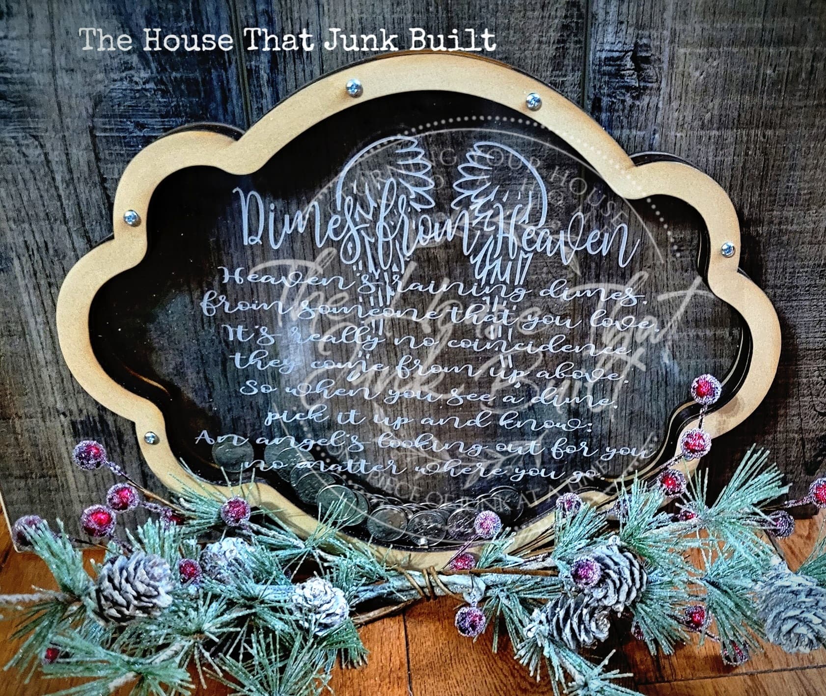 A place to store all those special dimes your loved ones send down for you. Made with wood and acrylic and features an engraved poem. Comes with keyholes to hang on the wall.