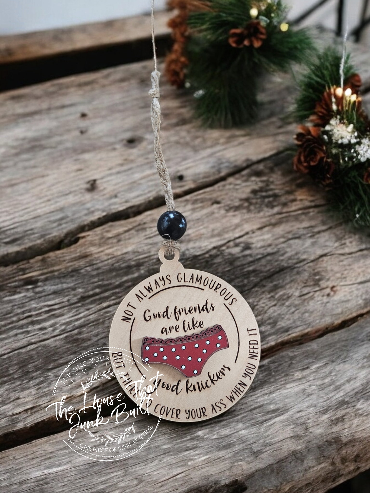 Add a playful twist to your holiday décor with this quirky and heartfelt knickers-themed ornament! Featuring an adorable design and a humorous saying that compares good friends to good knickers—"not always glamorous but always there to cover your ass when you need it"—this ornament is perfect for celebrating the unbreakable bond of friendship.