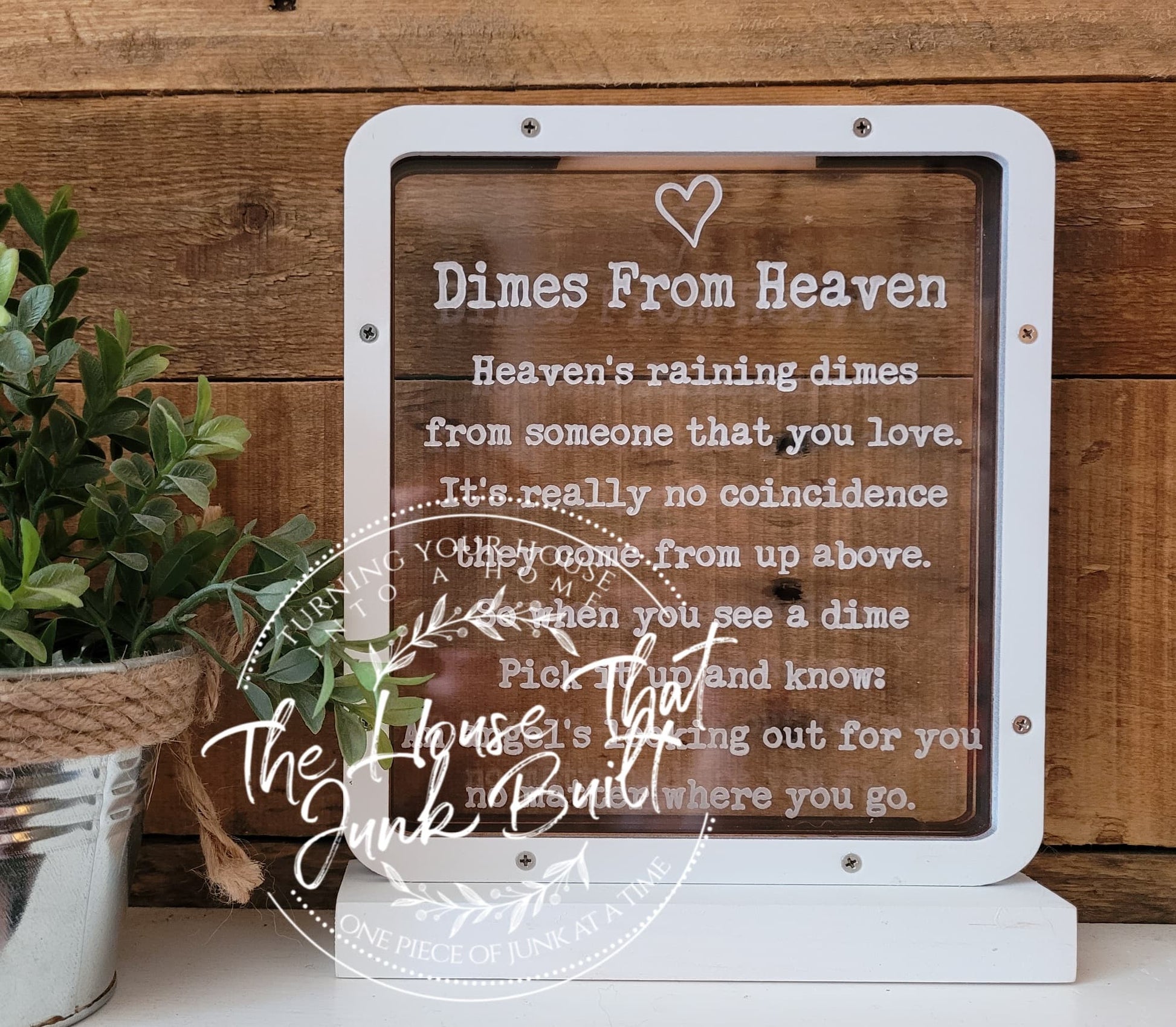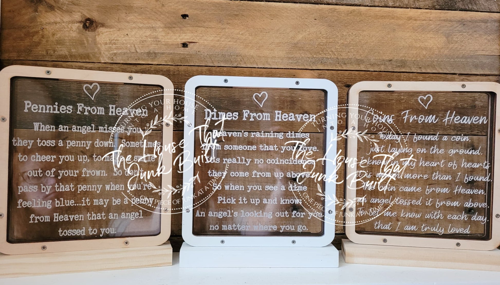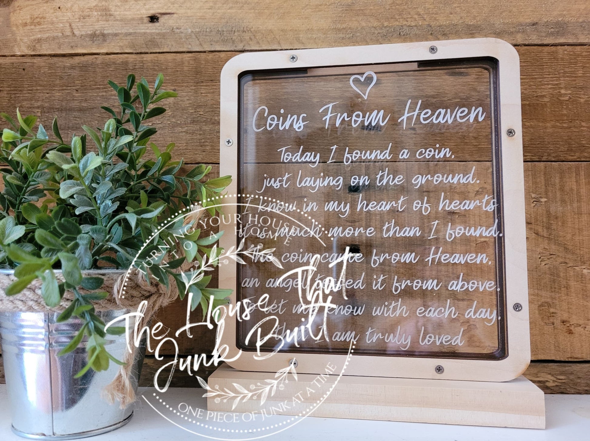 Embrace the memories and honor the legacy of your loved ones with our Pennies From Heaven Bank. This standing, handcrafted original design serves as a tangible connection to the cherished moments and the enduring love you hold in your heart. Let it be a symbol of remembrance, celebration, and the beautiful bond that continues to live on.