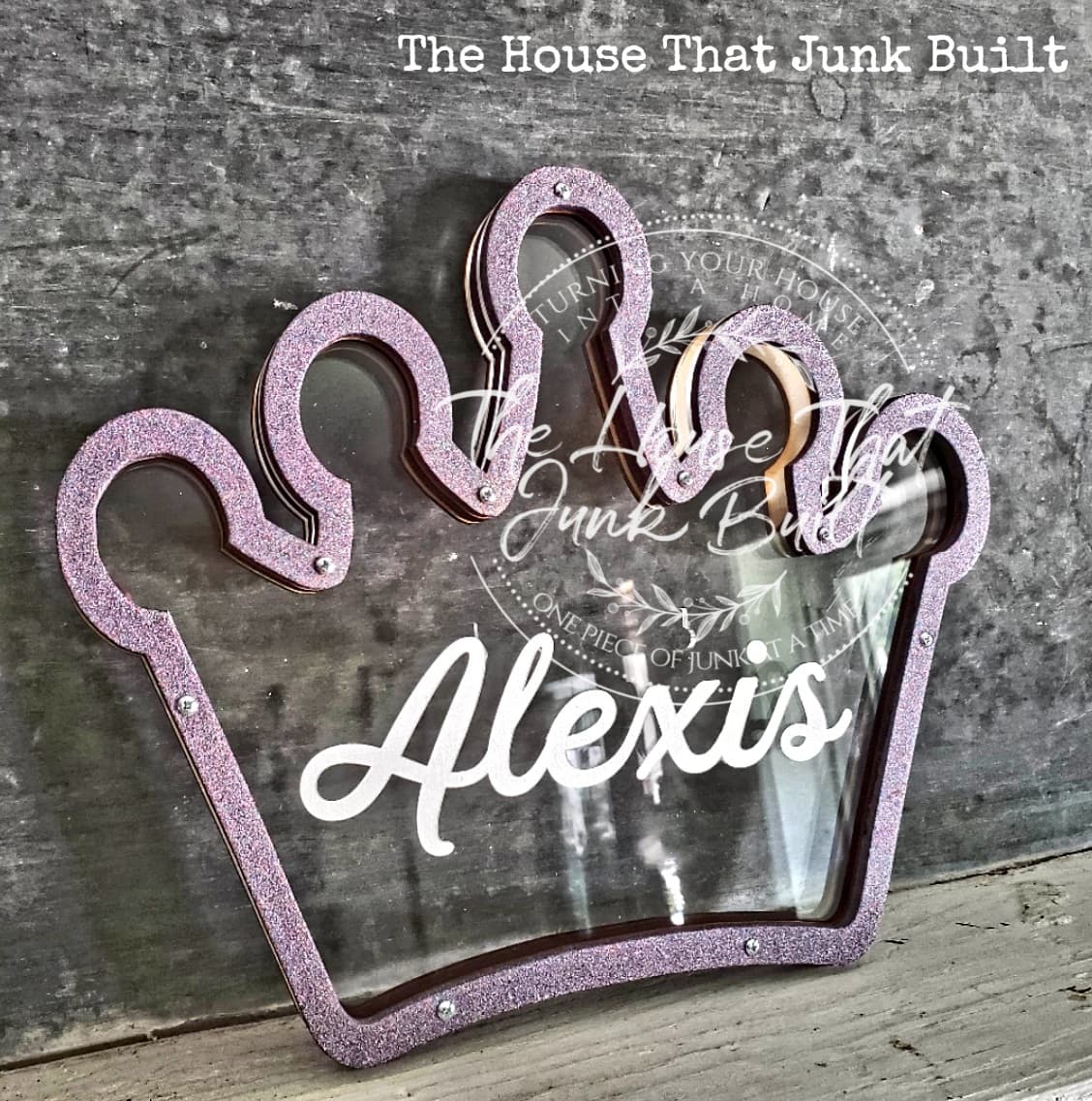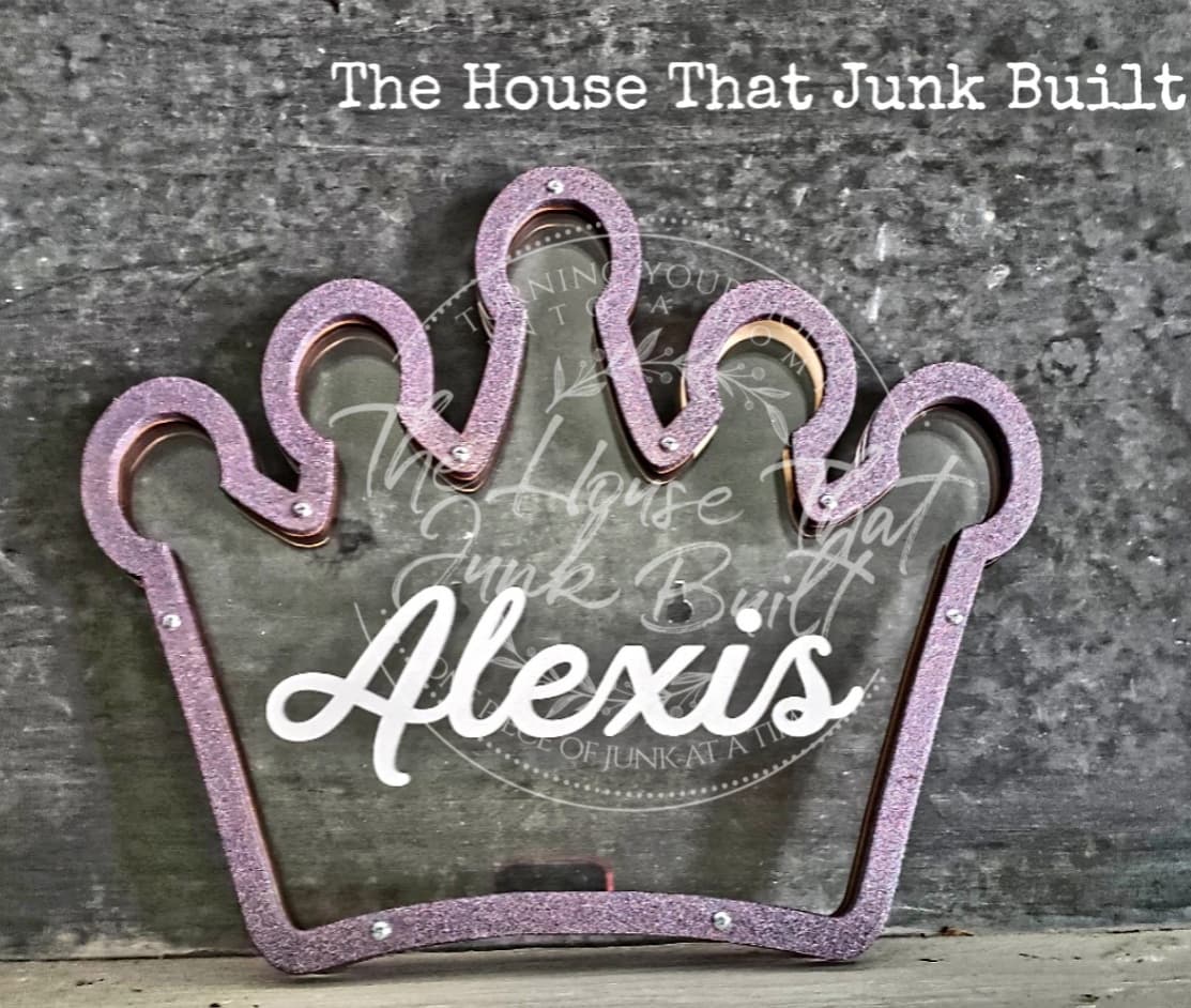 This adorable crown piggy bank makes a great gift for any little lady! Made from wood and acrylic, engraved, and finished off with a glitter frame your princess is sure to love it! Comes with keyholes for easy hanging on the wall and the hole is made large enough to dump the coins back out the top for easy removal. Measures approx 10.5x12x1
