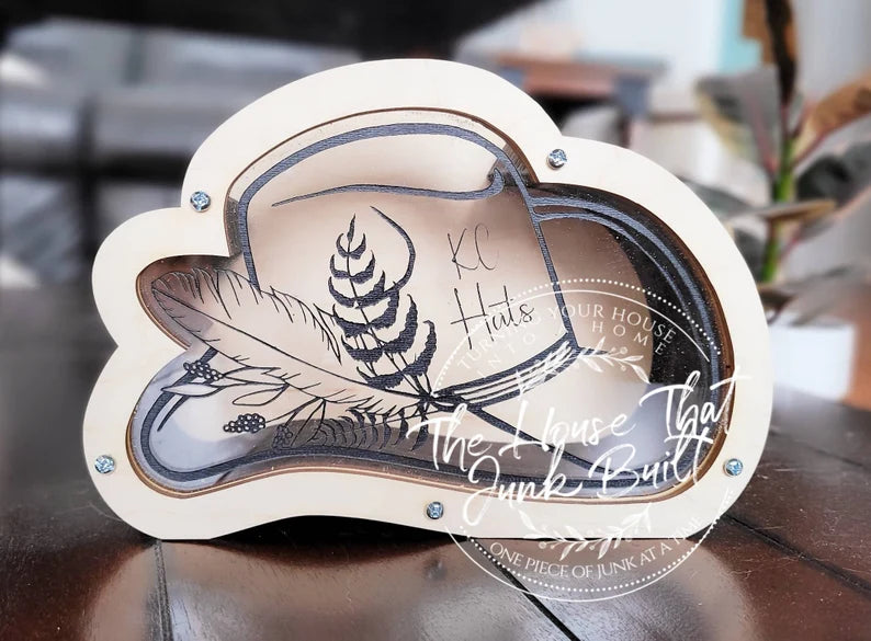 This tip jar is a one-of-a-kind creation that's shaped like a classic western hat, adding a touch of rustic charm and unique flair to your bar or establishment. This tip jar not only captures the essence of the Wild West but also provides a personalized touch with custom hand-painted designs.
